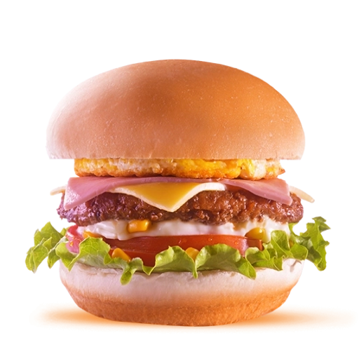 Pão, molho especial, hambúrger, bacon, presunto, queijo, ovo, tomate, alface
