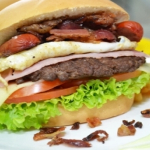 Pão, molho especial, bacon, calabresa, presunto, queijo, ovo, tomate, alface